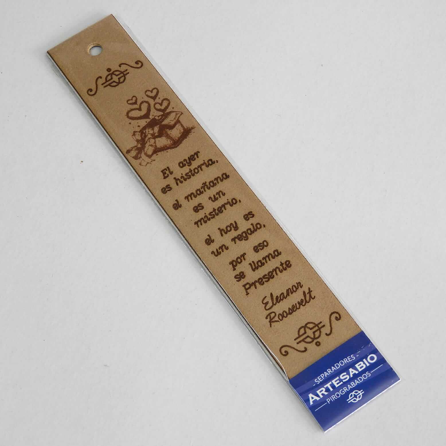 Separador pirograbado en piel sintética con la frase «El ayer es historia, el mañana es un misterio, el hoy es un regalo, por eso se llama presente» de Eleanor Roosevelt. El color del soporte de cartón puede variar al de la foto, así como el color del separador. Sugerimos vean todos nuestros separadores pirograbados para que puedan apreciar las variaciones.