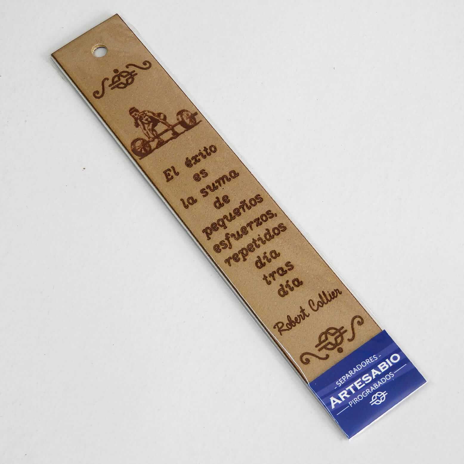 Separador pirograbado en piel sintética con la frase «El éxito es la suma de pequeños esfuerzos, repetidos día tras día» de Robert Collier. El color del soporte de cartón puede variar al de la foto, así como el color del separador. Sugerimos vean todos nuestros separadores pirograbados para que puedan apreciar las variaciones.