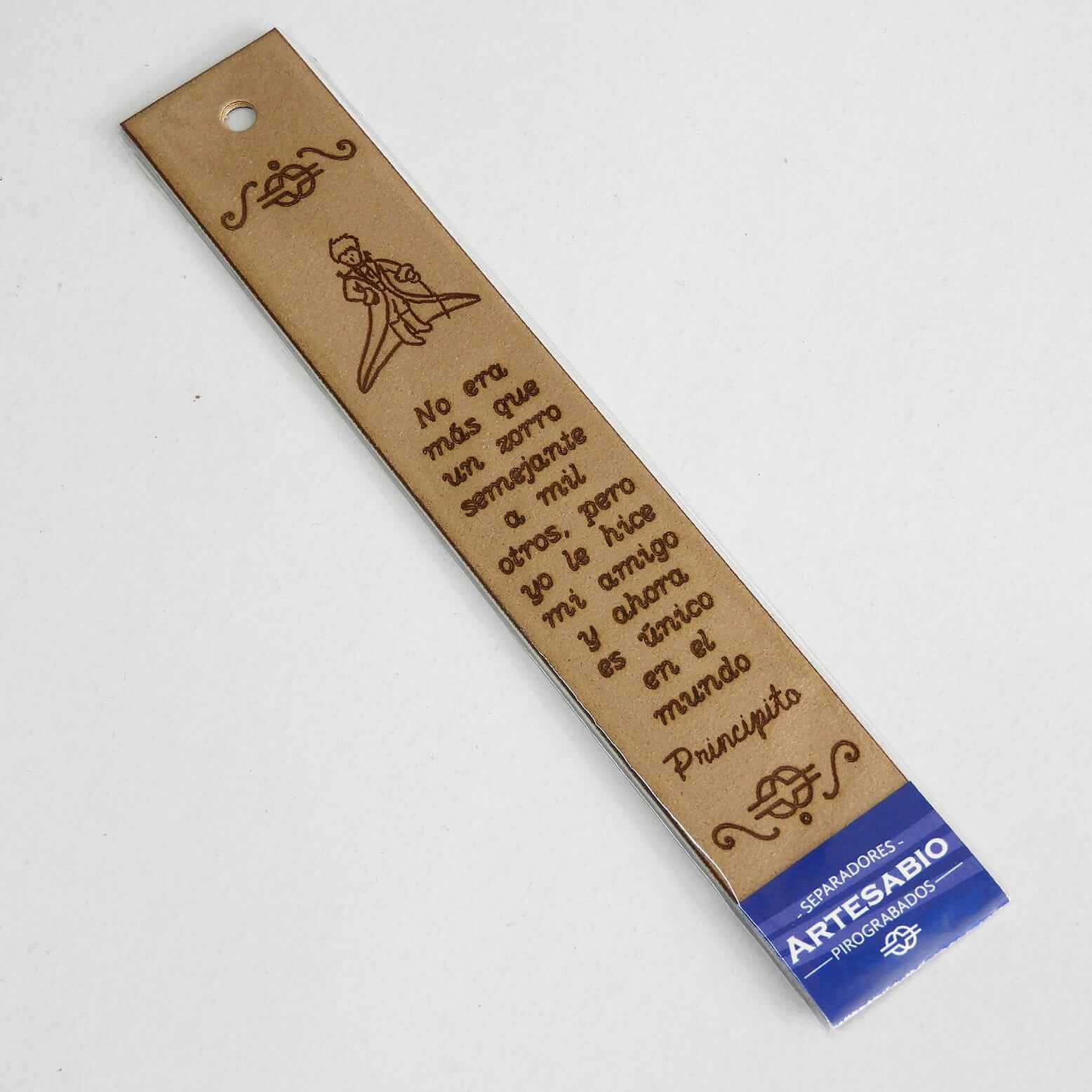 Separador pirograbado en piel sintética con la frase «No era más que un zorro semejante a mil otros, pero yo le hice mi amigo y ahora es único en el mundo» de El Principito. El color del soporte de cartón puede variar al de la foto, así como el color del separador. Sugerimos vean todos nuestros separadores pirograbados para que puedan apreciar las variaciones.