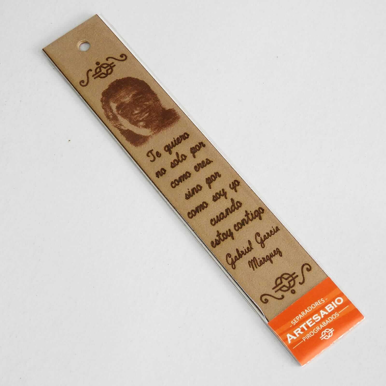 Separador pirograbado en piel sintética con la frase «Te quiero no solo por como eres, sino por como soy yo cuando estoy contigo» de Gabriel García Márquez. El color del soporte de cartón puede variar al de la foto, así como el color del separador. Sugerimos vean todos nuestros separadores pirograbados para que puedan apreciar las variaciones.